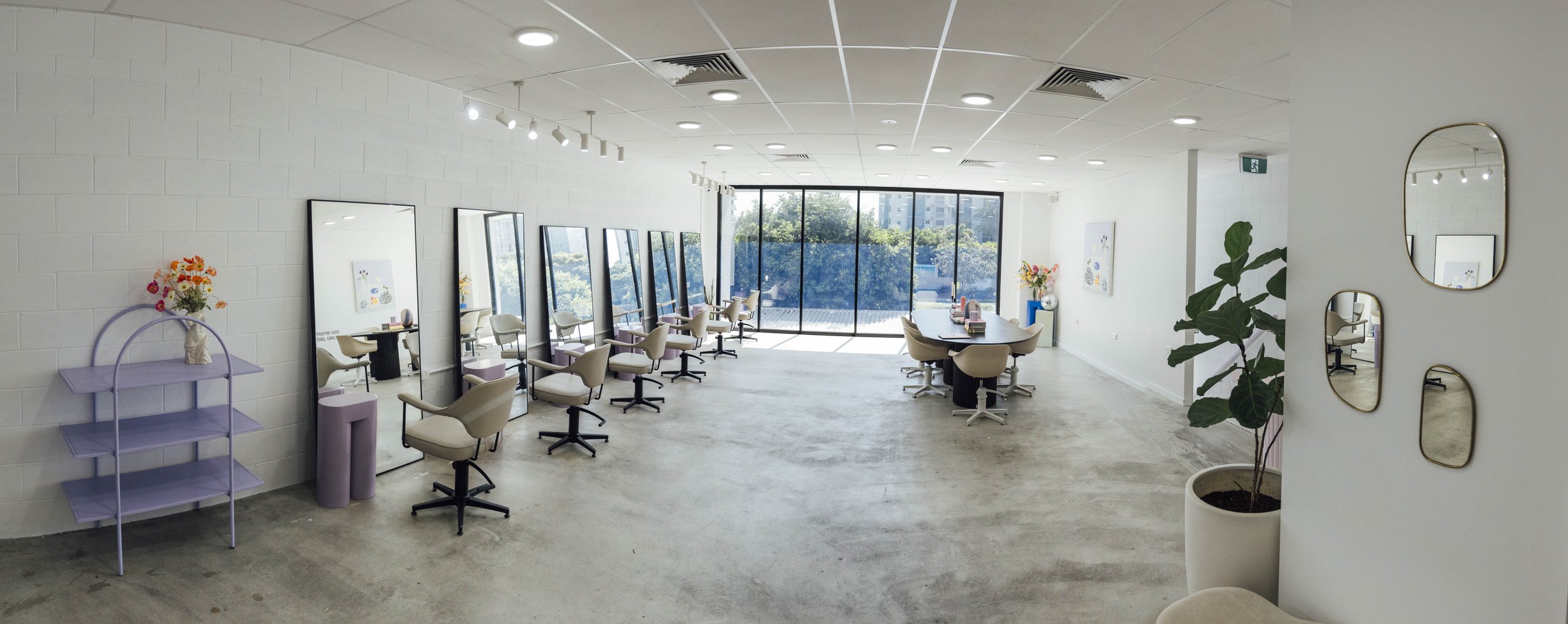 The studio features an open-plan main area, a large central table for workshops or group sessions, movable furniture to create the layout you need, private rooms for more intimate bookings, and styled corners perfect for content and social moments.